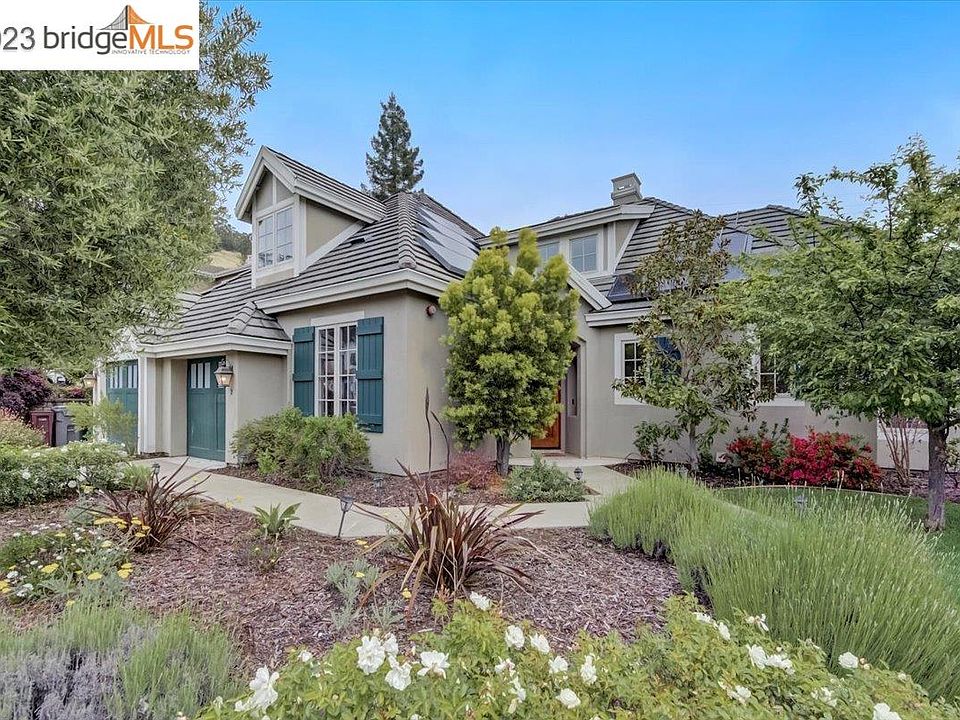 Charming French Country-inspired home with modern conveniences. Move-in ready home is one of 21 semi-custom designs. Graceful archways, elegant crown molding, and a spacious great room with soaring 14-foot ceilings opening to a serene garden for indoor outdoor entertaining. Chef's kitchen, boasting ample counter space and storage, and a newly installed professional grade single bowl sink. The main-level primary bedroom with garden porch is the perfect retreat after a long day. Modern conveniences include solar panels and two backup batteries for 7 days off-grid power, EV charging outlet, new 2019 HVAC system, modern smart CO2/Smoke detection system, and smart irrigation system programmable to auto-adjust to weather, season, and vegetation type. Nestled in a quiet and established neighborhood with a local bakery, minutes from Montclair, Joaquin Miller Park, schools, and Highway 13.