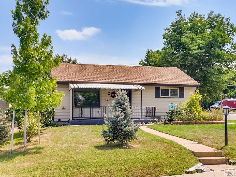 Updated ranch style home on corner lot with finished basement, central air conditioning and amazing front and back yards! New paint, carpet, tile and much more. New roof with heavy duty shingles. This well cared for home has been lovingly maintained and improved by the same owners since 1991 and the back yard is an outdoor paradise! You enter into a large living room that flows in to the bright kitchen with new stainless refrigerator, granite counters, tile floor, backsplash and stove/oven. The dining room is off of the kitchen and overlooks the lush back yard. There are two nice sized bedrooms on the main level as well as an updated full bathroom. The basement has one large non conforming bedroom, the family room and a large kitchenette with double sink and dining area as well as a good sized storage area. The lush front yard has new sod, seven new trees and five new lilac bushes. The incredible back yard is your new oasis and includes a covered patio, two sheds, two large concrete pads, a deck with hot tub, lots of flowers and flowering bushes, 1/4 crushed granite pea gravel, a secluded bird and squirrel refuge/feeding area and secured dog barrier fence. The back yard is very secure for children and pets. Six electrical outlets around the yard and four exterior double floods on motion detectors. Double picketed six foot wood fence. The detached garage is very large measuring 32'X24' with 18' wide and 8' tall steel framed garage door and 36 inch steel door and frame. The garage has no windows for security but has skylights for lots of natural light and lot's of extra storage above. New water heater. Updated electrical panel with 220 capacity, ornamental security bars over back windows, attic floored with 2X3s for extra storage and has solar powered vent, security storm doors, new led lights in basement & insulated steel siding. Patio furniture is included. Welcome to your new home in the Mile High City! This lovely home is being sold in "as is" condition.