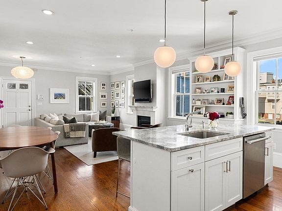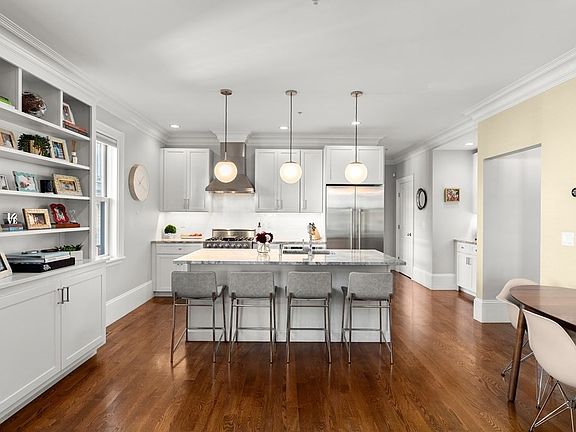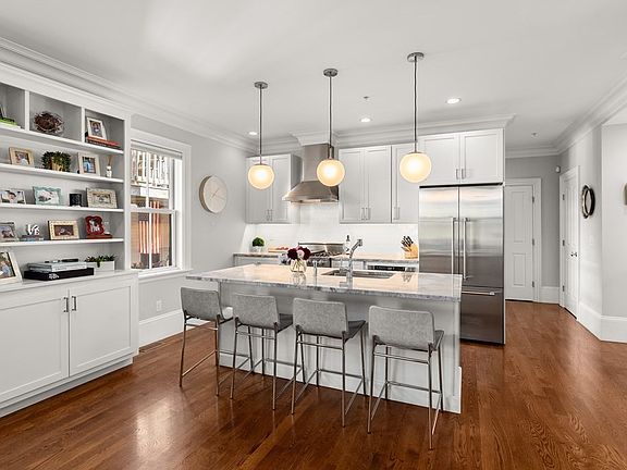 Steps from Monument Square, this 3++ bed/3.5 bath 2014 constructed 2,500+ sq.ft. townhome offers 3 exposures, 2 private entrances & roof deck with 1 parking! The entry level has 9’ ceilings, crown molding, chef’s kitchen with S/S appliances, separate bar area, Super White granite counters & large island. A powder room is adjacent to a double door pantry closet with ample storage. The kitchen opens to a sun-filled living/dining area with custom built-in & gas FP. The 2nd floor features 2 beds, bath & laundry. The oversized primary suite has 2 walk-in closets, a Carrara marble bath with double sink vanity and large shower with an adjacent office/nursery. Stairs lead to a private roof deck with spectacular Monument views. The lower level features a playroom with a custom built-in with desk & queen-size Murphy bed, gym, storage & full bath. High-end finishes throughout with walnut stained floors, 2-zoned HVAC, NEST thermostats & smoke detectors, recessed lighting & many updates throughout!