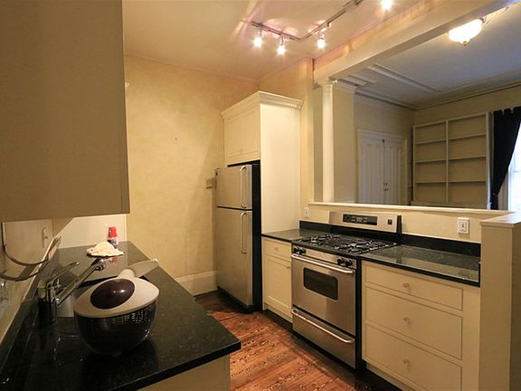 1st floor apartment. All hardwood floors. Heat and hot water are included in the rent. Enormous living room with dark hardwood and lots of custom built-in shelves. Beautiful galley open concept kitchen with custom cabs, granite, stainless appliances including dishwasher. Open area in back could be a bedroom or a dining room. Apartment has very nice built-in Murphy bed. Very cool shared roof deck. Nice private back porch and shared yard!! Big walk in closet / storage area. Street parking only. Pets negotiable on a case by case basis. Ref 130822 Deposits are full broker fee, first month and one month security deposit.