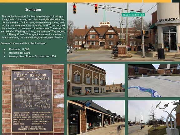 Amazing opportunity for multi-family income! Historic Irvington Duplex now available, walking distance to the heart of downtown Irvington and a quick commute to downtown Indy. This one of a kind property offers 3 bedrooms and 1 A1/2 bathrooms and nearly 1,500 square feet of living space per side. Brand new windows bring in tons of natural light to highlight the fresh white paint and new luxury vinyl flooring throughout the homes. Kitchens and bathrooms have been updated, NEW roof in 2015, New water heaters, new lighting, new historically approved windows throughout the home. New window AC units to be installed. Tenants will pay all utilities. Electric is separately metered; water & sewer is one meter. Self managed potential return