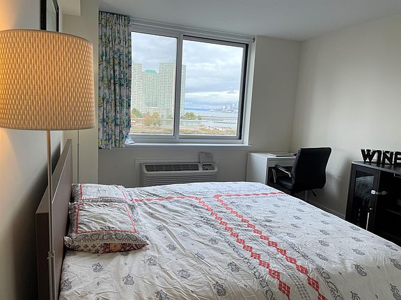 Gorgeous, corner 2BD/2BA unit w balcony apartment at Mandalay on the Hudson. This fully updated unit features views of NYC & Hudson River, floor to ceiling windows, updated hardwood floors, updated open kitchen w granite counter tops & added pantry, updated bathrooms, California closets & enclosed Washer/Dryer. All rooms have newer AC units, windows have new blinds with master bedroom having black out blinds. Unit comes with 1 deeded parking spot. Mandalay is a full service, pet-friendly waterfront building with 24 hr concierge, gym, pool, tot-lot, community room, BBQ patio. It has easy access to Newport Pavonia & Exchange Place PATH trains, Light Rail & Ferry.