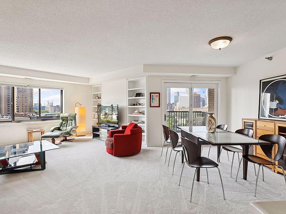 This could be your view! Unit 901 is a corner unit with downtown and northeast views from all living spaces, conveniently just steps to the elevator. Freshly painted and carpeted, the open floorplan is suited for urban living and entertaining. The living room features several large walls for art and built-in shelving for books and collectibles. The kitchen has stainless steel appliances, granite counters, tile floor and lots of cabinetry/pantry space and is open to the informal dining area. Use the extra space in the kitchen for prep or an eat-in space. Expansive view from the private balcony. The bedroom suites are ideally situated - the owner's suite, with full bath and hallway of closets, is at one end of the unit - and the 2nd bedroom with plentiful closets is at the other. There is another full bath in the hallway. Falls/Pinnacle's abundant amenities include fitness/yoga, pool, sauna, movie theater, business center, greenhouse, community room and beautiful landscaped terrace with grills. Amazing walkable Nicollet Island/St. Anthony Main neighborhood, steps to all the iconic restaurants, specialty shops, grocery, movie theater, biking and walking paths along the Mississippi.