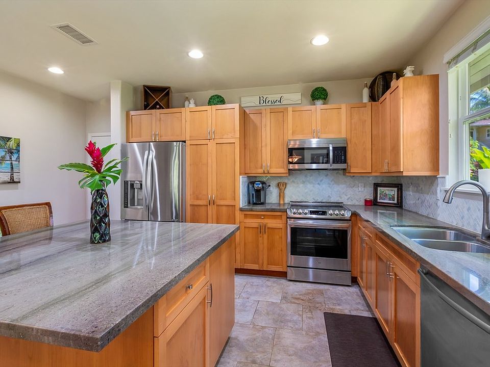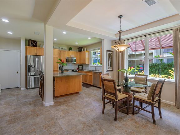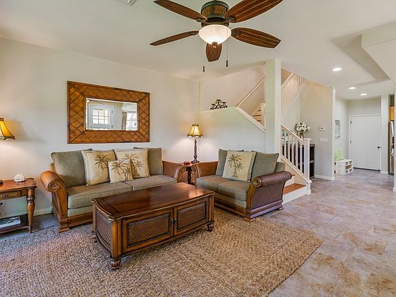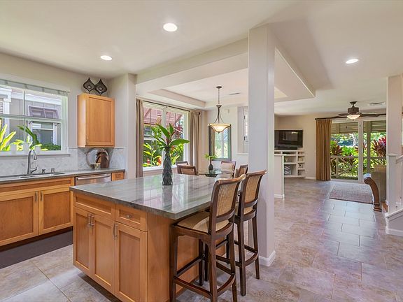 You'll be wowed by the condition of this home! Owner-occupied for the past 7 years with full upgrades throughout. Meticulously maintained. This "Makani" townhome is a favorite open floor plan and has a 2-car garage. Downstairs is the open concept living room, kitchen and dining area plus a half bath, all of which have high quality 18-inch tile flooring. Kitchen has high-end solid granite countertops and marble back splash along with newer stainless steel appliances. Stairway and upstairs have solid surface laminate wood flooring. The spacious primary bedroom has large lanai overlooking beautiful Makai Golf Course. The large en-suite bathroom has double vessel sinks, slab granite countertop, all new tile walk-in shower, soaking tub, private toilet room, and custom built-in shelving in the spacious closet. Also upstairs are the second bedroom with its own private lanai and ample closet, third bedroom with walk-in custom-built closet, den/office with custom barn doors for added privacy (currently used as a fourth bedroom), and convenient laundry with easy access to all bedrooms. Nihilani at Princeville amenities include a luxurious lava rock waterfall pool and hot tub with newly-installed tile, pool pavilion for added entertainment and private functions, bbq grills, tropical landscaping, cable and high-speed internet and guest parking. Within walking distance along the Princeville Path are golf courses, shops, restaurants, banks and more. The popular Hanalei Bay and Anini Beach are a short 5 minute drive from this home. Be sure to view photos and Matterport video.