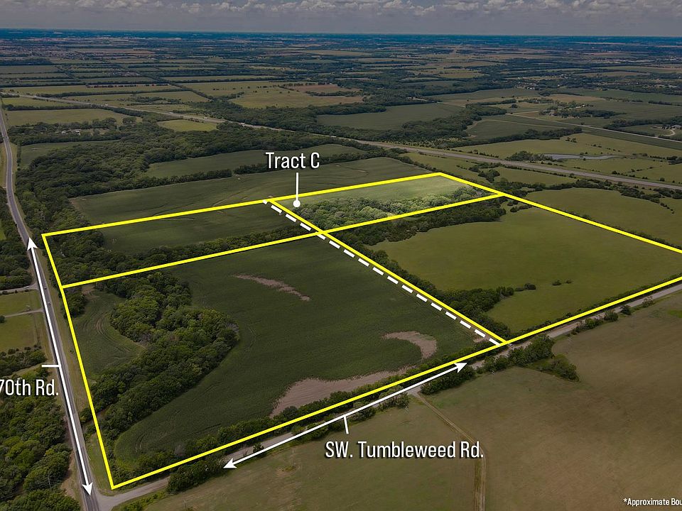 LIVE, OFFSITE AUCTION ON AUGUST 8TH, 2024 AT 6:30 PM. CLEAR TITLE AT CLOSING, NO BACK TAXES, PREVIEW AVAILABLE. NO MINIMUM/NO RESERVE!!! LIVE AUCTION WITH MULTI-TRACT BIDDING!!!  Don't let this unique opportunity slip away 20+/- acres available in a highly desirable location near Andover! Positioned close to the intersection of SW 70th/21st St and SW Tumbleweed Rd, this property ensures easy access to Andover, Benton and east Wichita. Situated within the Andover School District, this parcel offers the perfect backdrop for constructing your dream home while maintaining proximity to urban amenities. The property features beautiful rolling farmland and woods, creating an ideal setting for recreation and wildlife. If you're dreaming of a peaceful country lifestyle without sacrificing city conveniences, this is your chance. Don't delay - register today to bid on this exceptional property, which will be sold regardless of price. 20 +/- acres with access from SW Tumbleweed Rd Easy Access to Paved SW 70th/21st St Andover Schools Minutes to Andover, Benton and East Wichita Close to Santa Fe Lake Recreation Area Productive Tillable Farmland Wooded Areas Abundant Wildlife Electric Nearby This tract is part of a multi-tract auction featuring five adjoining parcels, totaling 118+/- acres. Buyers have the option to purchase any combination of the available tracts. The auction will take place off-site at The Cozine Life Events Center on August 8th at 6:30pm. Previously this auction was marketed as being five tracts A-E, however due to discussions with the county and platting regulations previous Tracts A and B which were 20+/- acres each are now being merged as one Tract to become 40+/- acres. The remaining tracts that were advertised will remain the same but will be renamed, what was Tract C originally is now Tract B and what were Tracts D and E are now C and D. If there are any question on this change, please contact the auction manager. A Multi-Tract Auction allows multiple tracts of real estate to be sold collectively or in any desired combination. This method of auction will offer multiple rounds of bidding allowing for bids on individual tracts, any combination of tracts, and all tracts together. The auction will begin with each tract being offered individually, followed by multiple rounds where bidders can make combinations and increase their previous bids to stay in the winning position. Bidding rounds will conclude when bidders no longer want to create new combinations or raise previous bid amounts. A digital board will be displayed to guide you through the auction process and have a clear understanding of current bid amounts. See "Downloads" section for explanatory PDF. Boundaries depicted in aerial images are approximate and estimated. Taxes on the individual parcels will be estimated at closing as final amounts will not be available until such time as the lot split is finalized. This property is offered subject to the Deed Restriction as stated in the John Kiser’s Quitclaim Deed dated August 21, 2018. This document can be found in the Supporting Documents. *Buyer should verify school assignments as they are subject to change. The real estate is offered at public auction in its present, “as is where is” condition and is accepted by the buyer without any expressed or implied warranties or representations from the seller or seller’s agents. Full auction terms and conditions provided in the Property Information Packet. Total purchase price will include a 10% buyer’s premium ($1,500.00 minimum) added to the final bid. Property available to preview by appointment. Earnest money is due from the high bidder at the auction in the form of cash, check, or immediately available, certified funds in the amount $15,000.