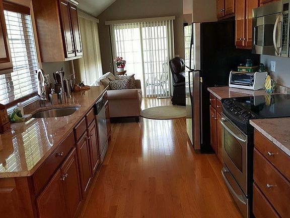 A must see. This home has any upgrades. Hardwood flooring throughout, wired for surround sound, granite counter tops. Enter into a living room with cathedral ceilimg, and a gas fireplace. walk out to a small deck off the living room. The kitchen is enhanced with beautiful Maple cabinets, stainless steel appliances and a microwave above the stove. Includes a nice little eating area at the end f the kitchen. The hallways are wider for wheel chair travel, and the bathroom adjusted for handicap assess. Includes a large master bedroom with lots of closet space, and a second bedroom for family or guest. The garage is equipped with automatic door opener, and a nice handicap ramp leading to the hallway entrance. A full basement is ready for adding a playroom or work area with a bulkhead lading to the back yard. Public transportation, shopping, and medical facilities close by.. Home is like new.. Located in a nice 55+ community.