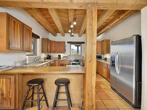 4 bedroom 3.5 bath custom home specifically sited on a piñon tree hilltop with majestic views of the Sangre de Cristo mountains. Iconic Santa Fe style featuring brick, wood and tile floors; vigas and latillas; hand-crafted cabinets and doors, and a wrap around portal. In addition to radiant heat, the home features 4 fireplaces plus a woodburning stove for maximum warmth during the winter months. Spacious living room with built-in shelving, picture window, and a curved white brick wall. Separate dining room has French doors which lead to the outdoor portal for expanded entertaining and al fresco dining. Kitchen is appointed with stainless steel appliances, breakfast bar, and a breakfast area with banco seating. Owner's suite opens to an outdoor deck with distant mountain views. 4th bedroom offers flex space as a media room, studio or office. Convenient location with easy access to I-25 and to the Santa Fe Museum Hill and Canyon Road. Hiking, fishing, hunting, biking, are only minutes from Apache Creek.