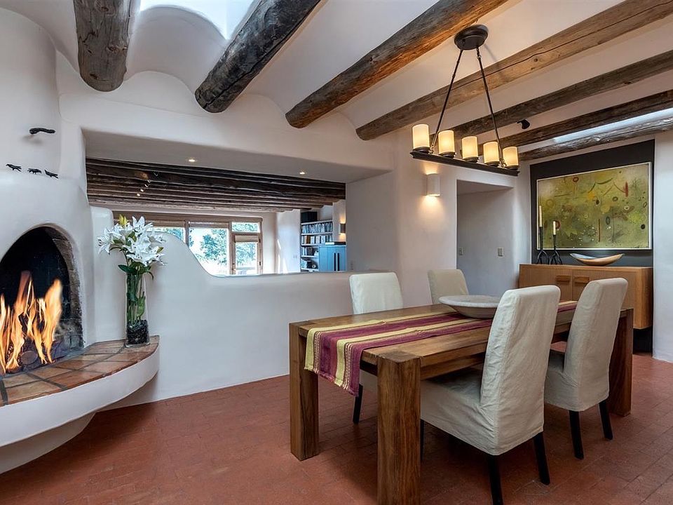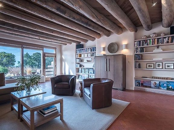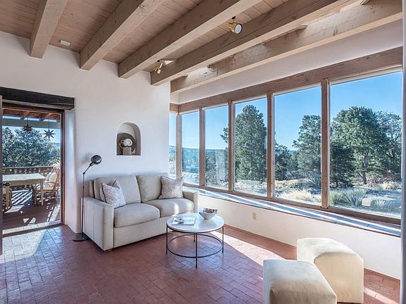 This very private and stylish adobe is perched on a high ridge with encompassing southern, northern and eastern mountain views on a very protected 10.9 acres. For those needing true live/work capacity, in 2005 the current owners converted the 36' x 72' Morton barn to a 1300 sq foot workshop (with one horse stall) and added a 1300+- sq ft radiantly heated, fully complimented studio. Other superlative features in the main house include gated access, roof solar panels and rotating solar array added in 2006/2009, three kiva fireplaces, brick, flagstone and saltillo tile floors, beautifully upgraded kitchen and baths, substantial ceiling treatments, custom built cabinets and doors, separate office, family room and sunroom, two brick patios off of living and master, east facing covered deck, incredible outdoor space designed by landscape architect Faith Okuma, two 12' Grow Y' Own raised vegetable beds with irrigation drip and winter electric heaters. Just north of the barn conversion sits a 24' x 30' heated RV garage built in 2008. All this on 2 legal lots of record that adjoin state land replete with hiking trails, varied wildlife and ponderosas, no HOA and minimal restrictions. Stunning rural serenity, style, utility and flexibility minutes from all that Santa Fe has to offer.