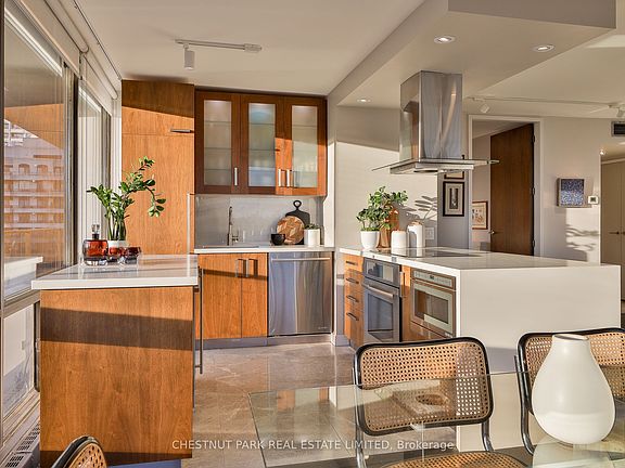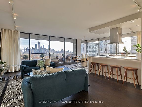 A completely turn key corner suite soaring above the treetops with clear south and west views of the city skyline and David Balfour Park. This beautifully renovated residence features two bedrooms, two full bathrooms, and a thoughtful layout that offers approximately 1180 square feet of interior living space with exceptional natural light throughout. The open concept living and dining area is surrounded by floor to ceiling windows and multiple walkouts to a generous wraparound balcony, creating a seamless indoor outdoor flow, ideal for morning coffee or evening sunsets.The fully renovated kitchen is both stylish and functional with top of the line appliances, upgraded finishes, and excellent storage. The spacious primary bedroom includes a walk in closet and an updated ensuite bath, while the second bedroom features a Murphy bed, double closet and walk-out to the balcony. Additional highlights include custom draperies and blinds, custom closets throughout, and abundant in suite storage. Residents of this well managed co-op enjoy exceptional amenities including a 24hr concierge, outdoor pool, gym, hobby room, library, party room, laundry facilities, EV charging stations, bike storage, and ample visitor parking. One exclusive use storage locker is included and underground rental parking is available. Ideally situated steps from the Yonge and St Clair subway, shops, cafes, dining, the public library, and nearby ravine trails, this suite offers an effortless lifestyle in one of midtown's most coveted park side communities. Maintenance fees include property taxes, utilities, cable TV, internet, building insurance, and common elements. Avoca Apartments Limited does not permit pets, rentals, or ensuite laundry.