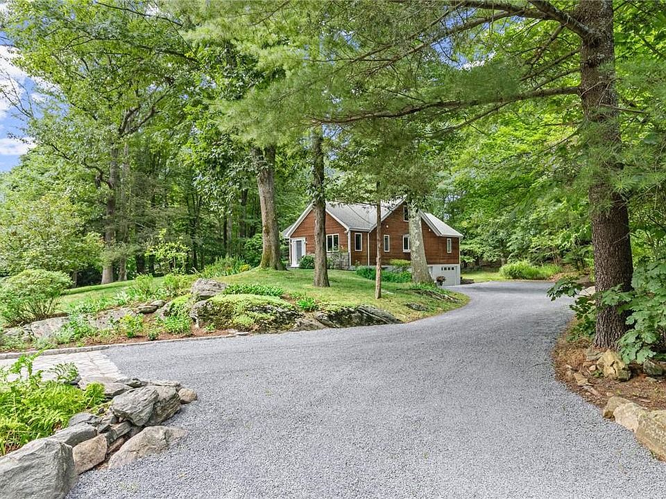 Accepted Offer / No more showings. This ranch home with 3 bedrooms and 3 baths on 1.76 acres offers a serene, private setting with park-like property featuring a spacious level lawn accented with natural rock outcroppings, stone walls and walkways. Vaulted ceilings, skylights, and large windows create a light, bright, and airy atmosphere throughout. The open kitchen creates excellent communication between rooms and provides easy access to the deck. The primary bedroom suite, with French door access to the large deck, adds to the appeal of this home.