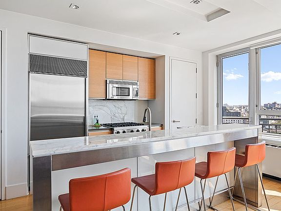 Indulge in contemporary living with an open kitchen featuring top-of-the-line stainless steel appliances from Sub Zero and Viking. The spacious breakfast bar, adorned with Calcutta Gold marble countertops, sets the stage for culinary creations and entertaining guests. Step onto the private balcony and immerse yourself in breathtaking views that stretch as far as the eye can see, offering a serene haven with uninterrupted views of the stunning Williamsburg skyline.