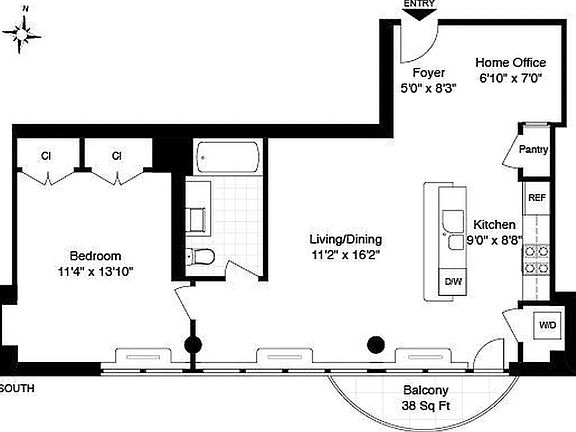 South facing large windows, soaring 11 ft ceilings, spacious open floor plan, home office corner, outdoor balcony, king sized bedroom, full bathroom with soaking tub, stainless steel appliances (Viking, Miele, & Subzero), and in unit washer/dryer (Bosch).