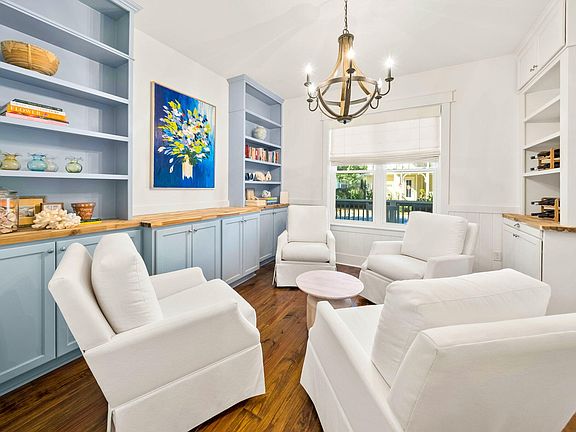 The primary suite on the main level features tray ceilings and a spa-like bath with a freestanding soaking tub, walk-in shower, dual vanities, and ample storage. The first floor also includes a renovated laundry room with butcher block counters, a wine refrigerator, and abundant cabinetry, along with a "sand room" just off the garage, complete with large cabinets and cubbies for storage, designed for easy beach living.