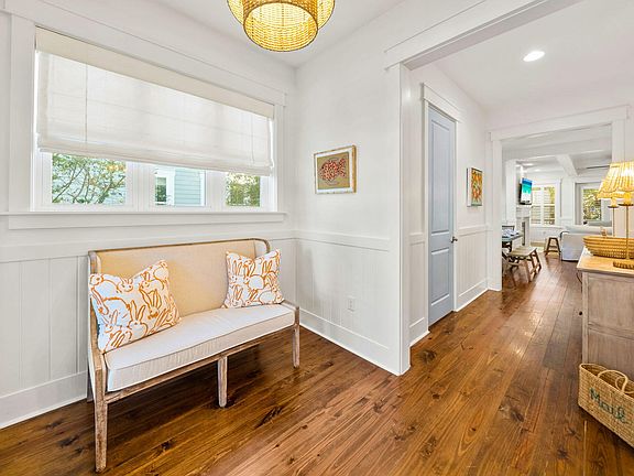 Located in the sought-after community of NatureWalk at Seagrove, just minutes from the sugar-white sands and turquoise waters of the Gulf, this beautifully updated home blends modern coastal style with everyday comfort. Built by Kolter Homes, the ''Sandcastle'' floor plan offers over 3,000 square feet of thoughtfully designed living space with four bedrooms, four-and-a-half baths, and multiple indoor and outdoor areas for entertaining. A large screened front porch with Bermuda shutters creates an inviting first impression and the perfect spot for morning coffee or evening cocktails. Inside, fresh paint, tall ceilings, and gorgeous hardwood floors set a bright and welcoming tone. The front den features custom built-ins with butcher block countertops, ideal for a home office or media space.