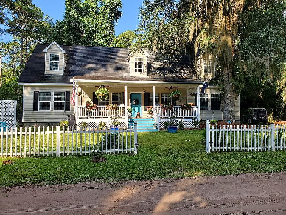 Spacious home on high ground tucked into a quiet corner of The Historic District. This house lives large! Turnkey, furnished property with nicely landscaped front yard and fenced back yard. Includes hardwood floors throughout first story, new stainless dishwasher, microwave and large double door refrigerator, reverse osmosis drinking water system, 15' x 25' bonus room upstairs set up with water and electric to add kitchenette space, three 4K smart TVs 60"- 50"- 40", radiant heat fireplace, beautiful 25' x 8' front porch with ceiling fans and spacious 25' x 12' screen porch on the rear of the house. First floor master suite with 2 closets (1 double door & 1 walk in) and a large bathroom. Well and septic field - no water/sewer bills with two water heaters, one on each floor. Wireless fiber optic high speed internet. Three zone HVAC - 1 upstairs/2 downstairs. Cars and golf carts allowed. No POA or HOA rules/fees. Walking distance to Lucy Bell's, D'Fuskies and The County Dock. Eight minute golf cart ride to the beach.