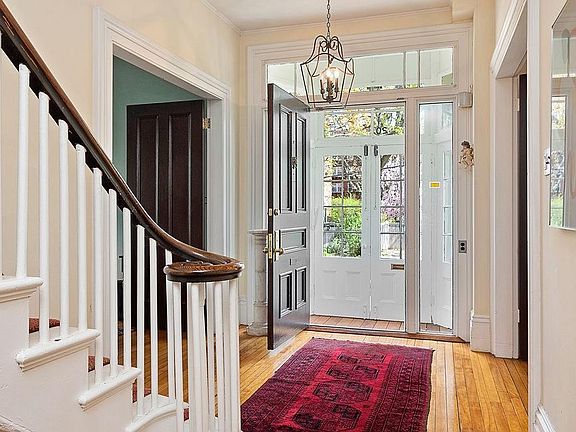 This stately center entrance Mansard, built in 1857 and located contiguous to the original Longfellow Estate, is a short distance to the Harvard Square T. Yet it is a quiet street populated with walkers, runners, and bicyclists. It has many of the fine features of the mid-19th century: Ten-foot ceilings, elegant moldings, oversized original windows, and a classic curved banister. The 16 rooms can be flexibly used as bedrooms, studies and family gathering rooms. The hub of the home is a sunny 31-foot long kitchen with gas fireplace. A wall of windows and doors from the kitchen lead out to a 26X18 foot deck, and the decks' wide staircase leads down to the large, two-tiered, south-facing yard with perimeter gardens and mature trees. There is an auxiliary apartment on the garden level. 20 Berkeley Street has the designation of being on the National Register of Historic Places and is located within the Old Cambridge Historic District.