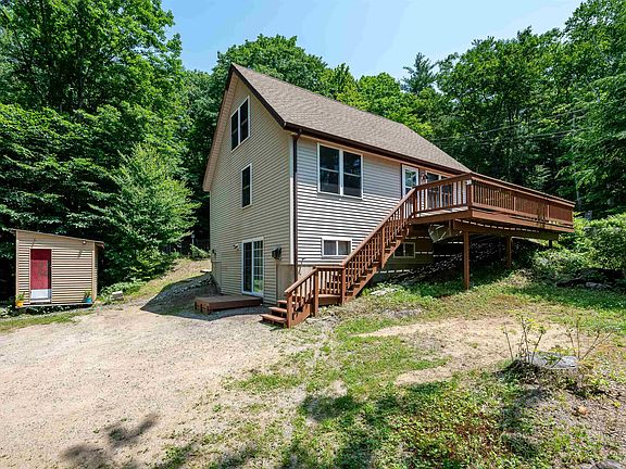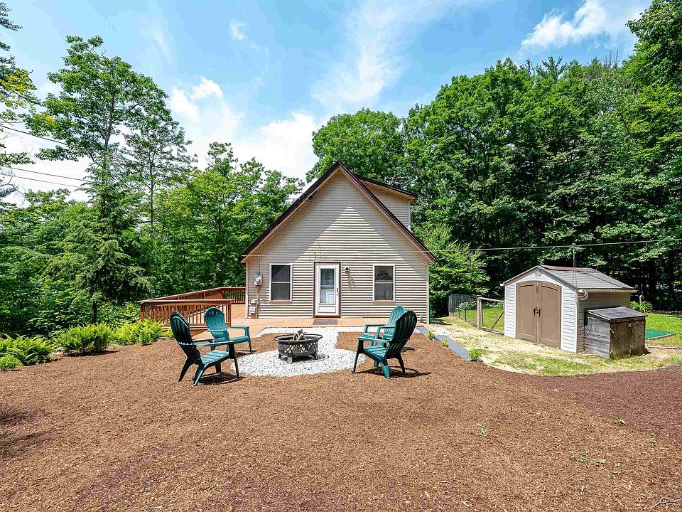 Ready for a summer at the Lake? This sweet, 2 bedroom, 2 bathroom cape home built in 2004 is part of Gilmanton's Sawyer Lake Village District, a private community with six beaches surrounding the beautiful 82 acre Sawyer Lake. NO HOA FEES! Great location only 20 minutes to Alton or Tilton, restaurants & more. Enjoy your privacy being surrounded by woods, & just a quick walk to the end of the street brings you to the closest private beach. Picture hosting BBQ's on your large wraparound deck, or winding down in the evening in front of your newly landscaped fire pit area. In addition, fully fenced in side yard is the ultimate spot for your furry friend. The interior is the perfect lake retreat, with plenty of natural light. On the 1st floor, the kitchen opens up into the living room & includes HW flooring & gorgeous high ceilings. There is a bedroom on the first level, in addition to a full bath & laundry room/walk in closet off of the bedroom. Upstairs you'll find the primary suite, complete with bathroom & jetted tub. The raised walkout basement level brings the coziness factor with a ton of flexibility for the space. This could be a home office, additional living space or guest area. Potential for a stove for added heating source. Sliding doors allow for easy access to the exterior. Room for storage space in the unfinished area of the basement as well. Open Houses Friday 6/21 from 5-7 pm, Saturday 6/22 10-1 & Sunday 6/23 10-12 pm. Come see why everyone loves the Lakes Region!
