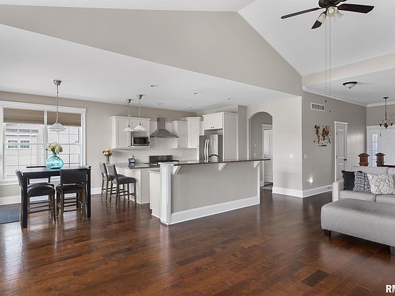 Amazing 4 bedroom, 3 bathroom ranch with over 3,000 square feet! Open concept floor concept with vaulted ceiling great room and gas fireplace. The eat-in-kitchen has a large island with breakfast bar and ample counter space, pantry, and stainless steel appliances. Sliding glass door leads out to deck and 2 patios, one with a pergola. 3 bedrooms on the main level. The primary bedroom has a trey ceiling, walk-in tile shower, double vanity, and a spacious walk-in closet. The finished basement offers a Built in wet bar, large rec room wired for a projector, gym room/flex space and forth bedroom, 3rd full bathroom and ample storage. Pleasant Valley Schools! Attached 3 car garage. Convenient location near bike baths, parks, interstates, Pebble Creek & DCC golf courses. Minutes from TBK Bett Plex. Call for your private showing today!
