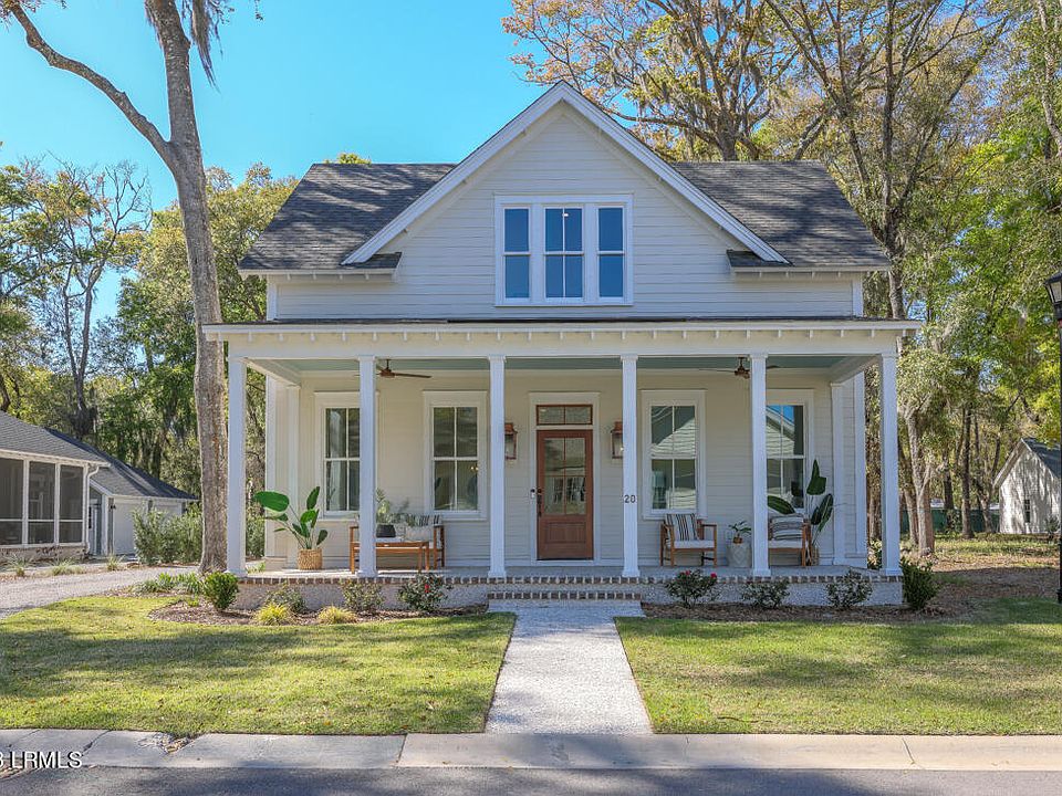 Move in Ready Home in Celadon featuring 1st level primary suite, laundry and 2nd bedroom, a classic covered front porch, large screened porch w/a gas fireplace, quartz countertops, hardwood floors, stainless appliances, large kitchen island, and spacious two-car garage.