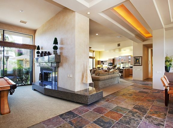 Stunning Sterling Estates home. South facing views. Open floor plan. Gourmet kitchen with attached family room. Formal living and dining rooms. Plus an additional den/office. Expanded master suite. Nice separation of bedrooms. Great mountain views from pool and spa. Covered patio with sexy warm glass fire features. Built-in barbecue. Move in condition. Furniture available outside of escrow. A golf cart away from Mission Hills and Tamarisk golf clubs