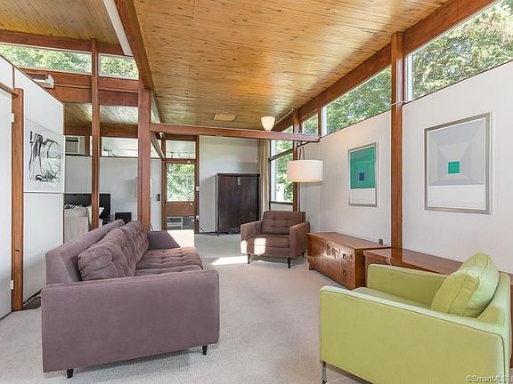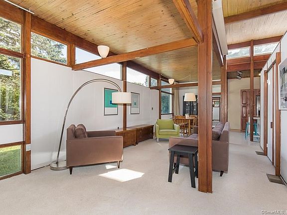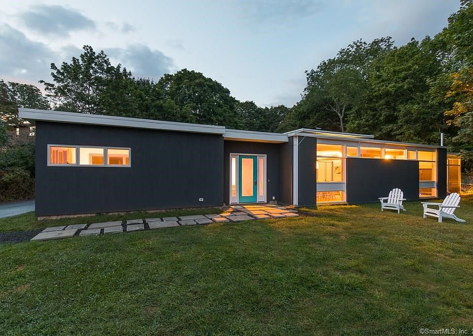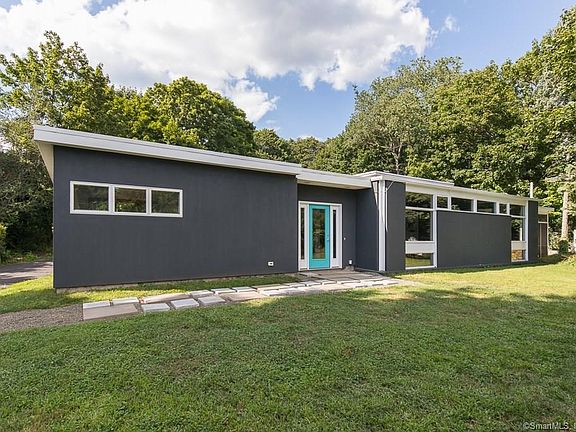 Set back for privacy, this mid century modern home designed by Yale architect Eugene Nalle is a must see! 1 level living with open floor plan, which is great for entertaining. Living room/ dining room opens to kitchen with granite counter tops and stainless steel appliances. Loads of windows and glass transoms. This home is full of natural light! Bright sun room overlooks large backyard. Updated baths. 3 bedrooms. Bonus room can work for a play room, home office or bonus room. Close to shopping on Hamden's famed magic mile, Rt 15 and a short drive to Downtown New Haven/Yale.