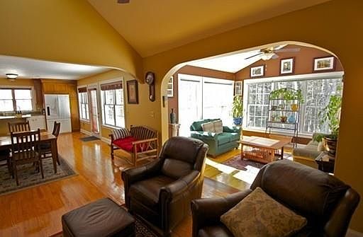 Forget about the hassle of building! Consider this impeccable Bear Hill Estates condominium that is already built and in one of the most private locations in the complex with the woods as your peaceful backdrop. With a Craftsman style sensibility, the open floor plan on the 1st floor includes hardwood floors, arched doorways, built-in bookshelves flank a gas fireplace, vaulted ceiling in living room, kitchen with granite countertops, stained oak cabinets (Mission style), breakfast bar and access to a large Trex deck off the dining area. Cozy sunroom off living room offers peaceful tranquility. 2 en-suite bedrooms, 1 up and 1 downstairs as well as 2 extra bedrooms. 3 full bathrooms and one1/2 bath. Spacious,finely finished room in the walk-out lower level with full windows as well as an extra room that would be ideal as a home office. Heat and a/c is zoned, so each floor could be climate controlled as needed. 2-car garage. 55+ community. Access to bike path, Look Park and Florence!