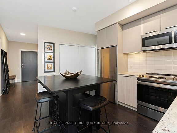 Absolutely gorgeous 1 bedroom + den suite offering sweeping, unobstructed views and a generously sized balcony bathed in warm south-west sunlight, the kind of exposure that turns ordinary evenings into golden-hour perfection. Soaring 9' smooth ceilings and wide-plank high-performance laminate flooring create a clean, contemporary canvas throughout. The sleek modern kitchen is as stylish as it is functional, complemented by stainless steel appliances including fridge, stove, dishwasher and microwave, plus in-suite washer and dryer for everyday ease. Thoughtfully finished with contemporary lighting, this suite also includes parking and a private locker, ensuring convenience never feels compromised. Residents enjoy an impressive collection of amenities including 24/7 concierge, fully equipped gym, guest suite, visitor parking, and a stunning 7th-floor event space with BBQ, terrace lounge and outdoor dining, perfect for entertaining or unwinding in style. Steps to public transportation and moments from the shops, restaurants, and cafés of Dundas and Bloor, this location balances city living with access to the Humber River trails right outside your door. Downtown Toronto is just a short drive away. Sophisticated, connected, and beautifully executed - this is urban living done right.