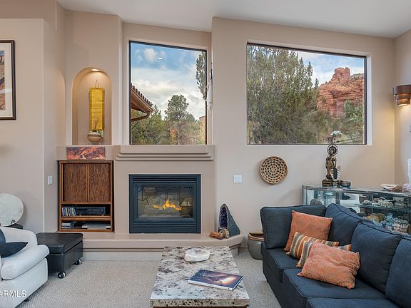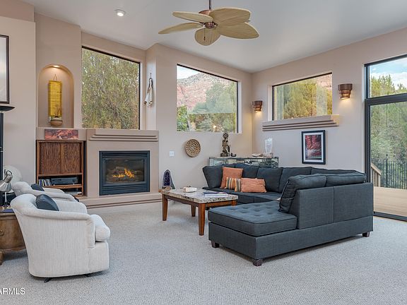 Dramatic Thunder Mountain red rock views from this single level modern home with inlaw/ studio space. Modern home with split bedroom plan and oversized living room opening onto rear patio with direct red rock views. Upscale neighborhood surrounded by more expensive homes is ideal for a full time residence or escape from big city life complete with trails nearby to explore the vast Sedona trail system with nearby access. Main home was remodeled to add an inlaw/guest suite that could also be an ideal home office/studio space with separate entrance. Main living space opens onto the elevated rear patio and encourages lounging and meals in the shade with massive red rock views! Backyard storage shed for your collectibles and storage needs!