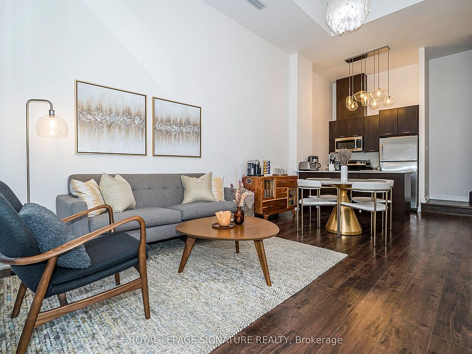 3-Bedrooms, 3 Full Bathrooms In This Rarely Offered Townhome with Soaring Ceilings! Don't miss out on this exceptional opportunity to own a beautifully maintained townhome where each bedroom enjoys its own private or semi-private bathroom offering an ideal layout for both investors and end users. This thoughtfully designed residence perfectly blends comfort, functionality, and refined style. The open-concept main level boasts high-quality laminate flooring throughout, dramatic 15-ft ceilings, and floor-to-ceiling windows that flood the home with natural light. A private patio extends the living space outdoors, creating a welcoming retreat for relaxation or entertaining. The chef inspired kitchen is beautifully appointed with a double undermount sink, quartz countertops, breakfast bar, and sleek cabinetry, making it perfect for both everyday living and hosting guests. The primary bedroom features a 4 piece ensuite, walk-in closet, and a private balcony, creating the perfect blend of comfort and privacy. A versatile den area offers an ideal space for a home office or reading nook. Every detail reflects pride of ownership, from the pristine finishes and beautiful upgraded light fixtures to the automated Hunter Douglas blinds on the main floor and custom blinds on the second level. Residents of this boutique community enjoy a wide range of amenities, including 24-hour concierge service, a fully equipped fitness centre, rooftop terrace, spacious party room, guest suites, media lounge, and visitor parking. The location is unbeatable with easy access to King West, Billy Bishop Airport, and TTC transit at your door, plus nearby parks, waterfront trails, restaurants, and entertainment. Everyday essentials are just steps away, with a Farm Boy up the street and LCBO, Loblaws, and Shoppers Drug Mart conveniently located across the road. The Rogers Centre, CN Tower, and countless downtown attractions are also just minutes from your door.