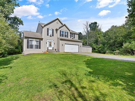 Charming colonial style home for sale located in Oswego, NY! This 2001 built home features four bedrooms, two full bathrooms and one half bathroom. Completely remodeled interior and hardwood flooring throughout. Formal living space with cathedral ceilings and great natural lighting from the skylights. Spacious kitchen with island and brand new stainless steel appliances. Breathtaking formal dining space with accent wall and built-in electric fireplace. First floor laundry and half bathroom for convenience. Oversized primary bedroom and bathroom combo with jacuzzi tub and double sink vanity located on the second level of the home. Three additional guest rooms with separate full bathroom. Two car attached garage and gravel driveway. Nestled on 1.11 acres of land with a back patio and private yard. Shed and trampoline convey with the sale of the home.