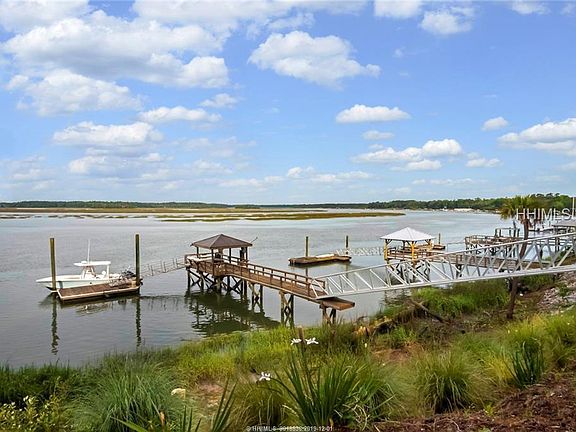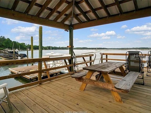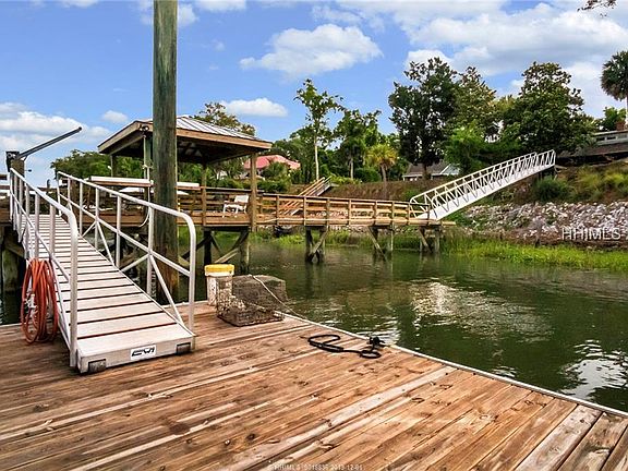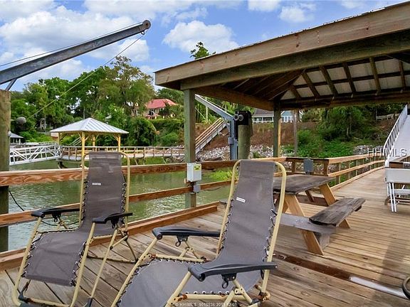 Amazing May River home on a high bluff, walking distance to Old Town Bluffton. This older home has awesome sunrises and sunsets. Newly constructed dock with covered area and new rock embankment. The guest cottage boasts an upstairs 2 bedroom and downstairs 1 bedroom apartment. Great income potential. This is a rare opportunity to find a location in the most desirable area of Castle Point off Alljoy Road. Build your own family compound or enjoy the cottages as they are. Golf cart to all the areas of Old Town.