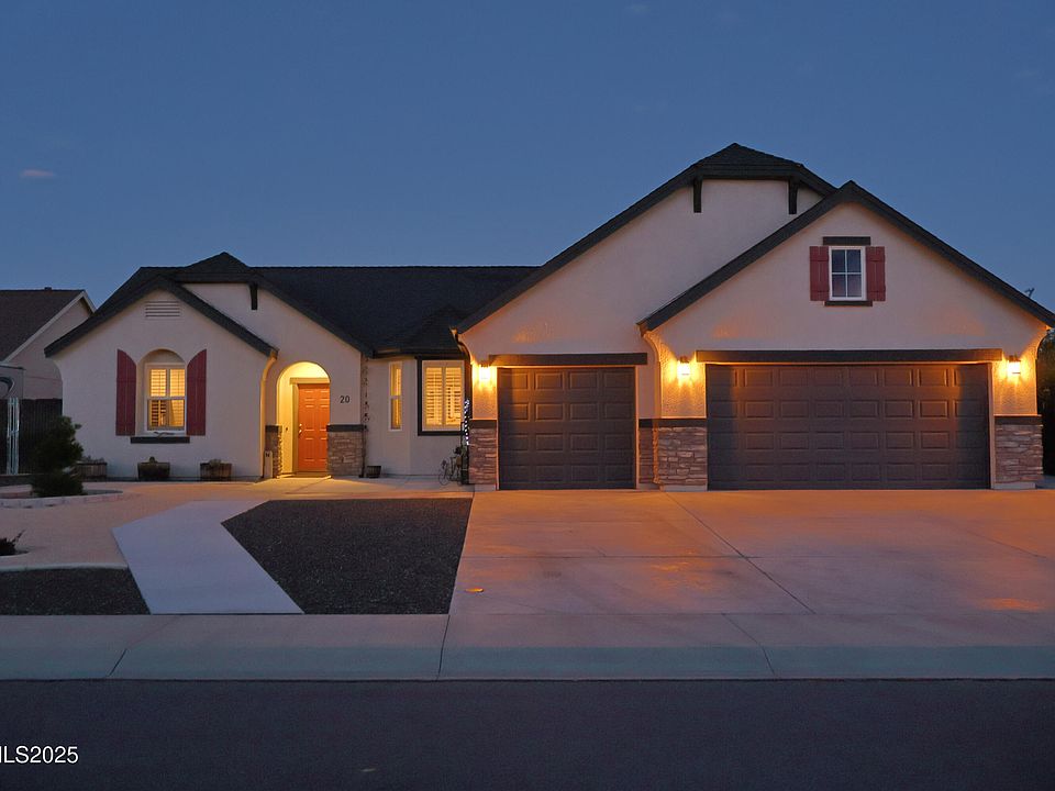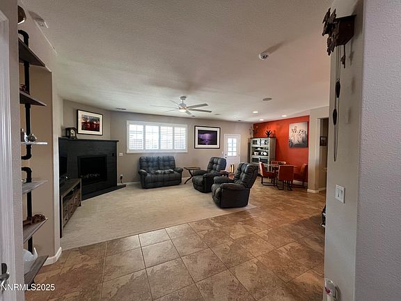 Welcome to this beautifully updated single-level home on a quiet cul-de-sac in Blue Stone Estates Ph 1. Built in 2004, this 1,584 sq ft residence offers modern comfort with extensive recent upgrades. The open floor plan is anchored by a Regency Proflame Grandview gas fireplace (36,000 BTU, remote/timer, battery backup) that doubles as an efficient heat source. The kitchen features granite counters, ample cabinetry, and a newer GE built-in microwave. The primary suite includes a remodeled bath with quartz counters, dual faucets, and a 46"x48" walk-in shower with acrylic walls. The guest bath has also been refreshed with wide-plank porcelain tile and LVP flooring. Additional highlights include plantation shutters, Lifeproof pet-proof carpet with upgraded padding, ceiling fans, and fresh Sherwin-Williams paint inside and out. Upgrades include a Navien tankless water heater, Rheem furnace, Bluetooth garage door openers, and easy-connect hose bibs. Outdoors, enjoy a 32'x14' Alumawood covered patio, 12'x12' pergola, 12'x14' Tuff Shed, RV parking with desert-friendly landscaping, chain-link side gates, and solar-powered yard lighting. The fenced backyard offers privacy, mountain views, and plenty of space. Parking is abundant with a rare 4-car tandem garage. Appliances and other items are negotiable. Conveniently located near shopping, dining, parks, and BLM land for endless recreation. Move-in ready and waiting for its next owners—schedule your showing today!