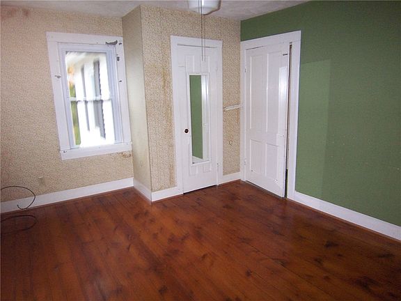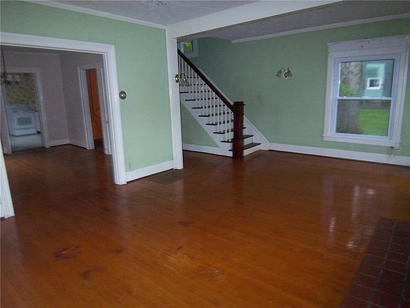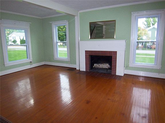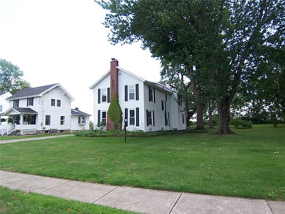 Very solid 2-story village home with 4 bdrms/1 BA. The exterior of the home is vinyl sided with all new tip in windows. There is an eat-in kitchen with a pantry and includes a stove and dishwasher, formal dining room, and living room with a wood burning fireplace. There is a small room off the dining room that could be used as an office/den or possibly a full bath. There are two staircases leading to the second floor. The inside needs updating which is an opportunity for you to make it your very own home. There is an 80 sq. ft. patio on the back of the home. The 1.5 detached garage is new. There is a Liftmaster garage door opener. The electric in the garage is 100 amp. The driveway is cement. It is a shared driveway. Beautiful large yard.