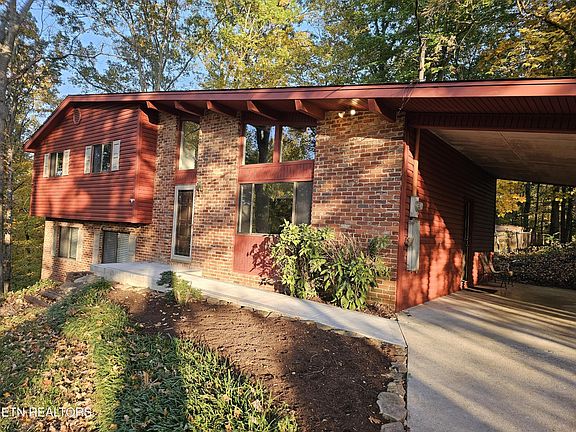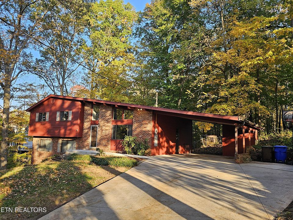 Great Oak Ridge location for this beautiful 3 BR, 2.5 Bath Mid-Century Modern home that is tucked away at the end of a cul-de-sac. When you enter into this home you are greeted with soaring cathedral ceilings with rustic beams and real hardwoods that flow into the large Eat-In kitchen area with a generous amount of countertop/workspace. Great design and features within this home offer options for enjoying this property to its highest potential. Top floor features a very spacious primary suite with a large walk-in closet and updated bath plus a second bedroom or office space and another full bath with access to tons of extra storage space. Lower level has another bedroom, a half bath with a large separate utility area that could easily be converted into another full bath if you so desire. In addition, a large but cozy family room boasts a stately all brick wood burning fireplace plus walk-out access to a huge, partially enclosed & covered porch room to enjoy the outdoors. Extensive tiered decking for relaxing and/or entertaining outdoors. NEW ROOF installed 2022. Carport is designed with additional RV or additional car parking space beside covered area plus for added convenience there is also a separate built in storage closet. This lovely home is located within walking distance to Jefferson Middle School and just 5 minutes away to local shopping and dining.