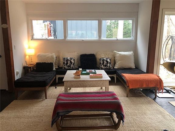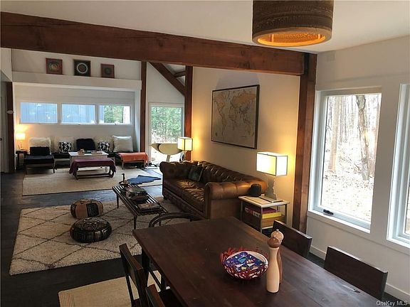 Nestled into the surrounding woods on just over 7 acres, this post and beam contemporary house has much to offer anyone looking for peace and privacy. Fully furnished 2 bedroom 2 bathroom house with plenty of space for an office and flex use space for kids that may be home from school. September 15th occupancy, short term only.