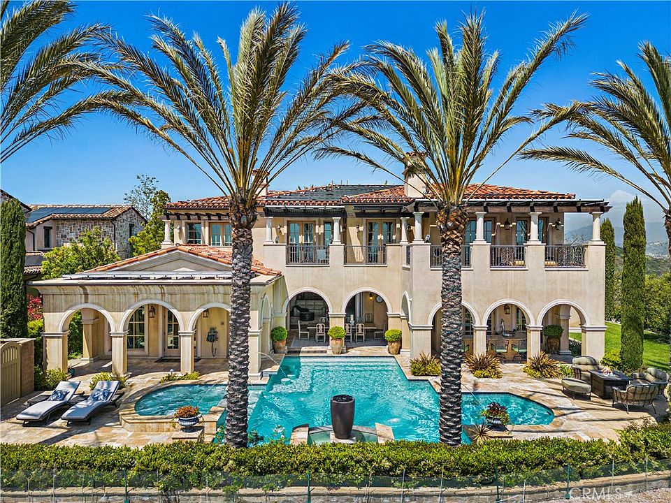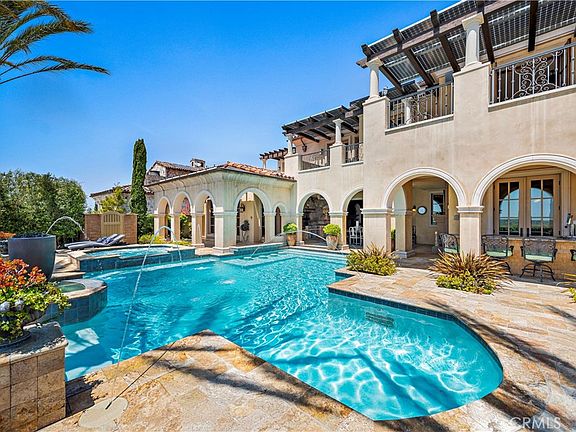 Embraced by the most coveted homesite at Covenant Hills in Ladera Ranch, this extraordinary custom estate provides unobstructed 300° panoramic views of permanent open space, gently rolling hills, shimmering evening lights and distant ocean views. These breathtaking vistas enrich both the grounds and most living areas of the ultra-private Italian Revival residence, which is located behind impressive gates at the end of a tranquil cul-de-sac with only one direct neighbor. Approximately 6,561 square feet, the luxurious villa reveals four ensuite bedrooms, each with a balcony or loggia and a walk-in closet, and five- and one-half baths. A grand entry hall with high ceiling, massive arched doors and a multi-tiered staircase offers an appropriately dramatic introduction. An oversized great room is the heart of the home, opening to the backyard and a chef-worthy kitchen with two islands, a walk-in pantry, nook, stone countertops, heated floors, farmhouse sink, built-in refrigerator and a six-burner Wolf range. In the adjacent family room, a glass wall system allows it to be closed off from the rest of the home while maintaining a visual connection. Those who enjoy memorable entertaining will appreciate the residence’s inclusion of a home theater with wet bar, motorized curtains, a big screen and terraced seating. Further enrichments include a home office with layered woodwork, a salon with built-in wash station, a gym and steam room that can become a fifth bedroom, and a formal dining room with oval coffered ceiling, soffit lighting and a wine-tasting area with built-in temperature-controlled wine storage. Framing views that can reach the ocean and Catalina Island on clear days, the sumptuous primary suite presents two balconies, a retreat, fireplace, walk-in closet, resort-inspired bath with heated floors, a wet bar and a mini refrigerator. Exquisite craftsmanship is demonstrated through the inclusion of cross-vault cloister ceilings, masterful woodwork, wood flooring, New Zealand wool carpet, extensive custom built-ins, & wood-framed archways. Solar power, smart-home tech, four-zone HVAC, whole-house and individual audio systems, and garage parking for four are also featured. Nearly 16,424 sqft, the desirable promontory is home to a five-star pool with jet-stream swim current, a bubbling spa, a spacious heated loggia with outdoor kitchen & grill, and a sit-down bar with tap service. A putting green, private motorcourt & a dog run are included.