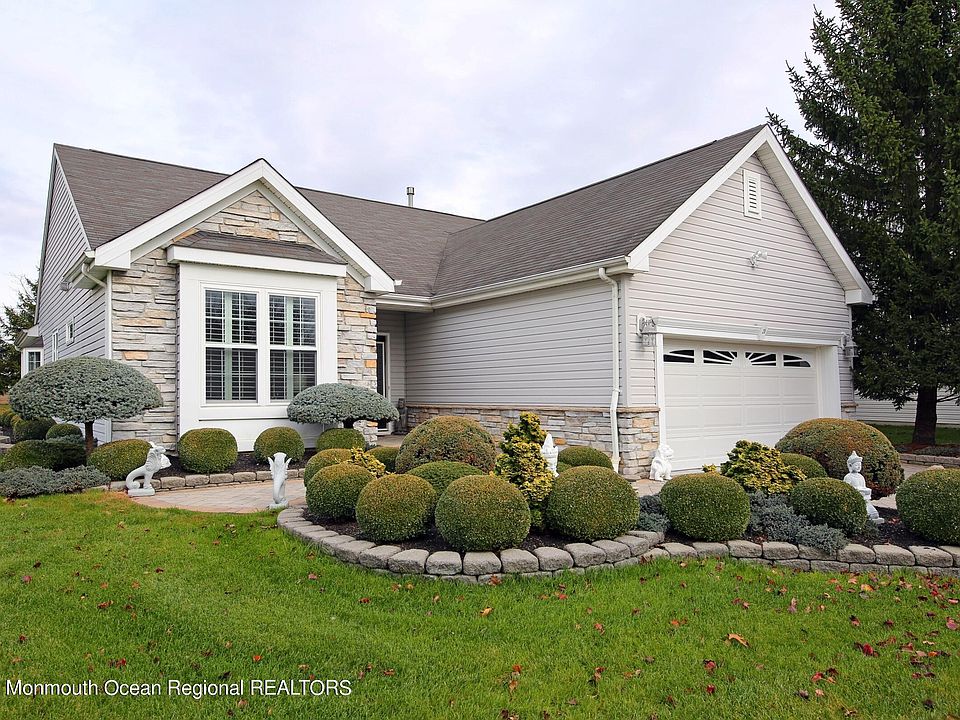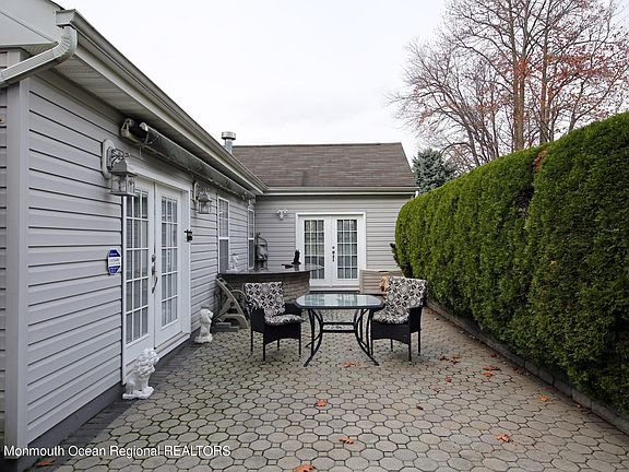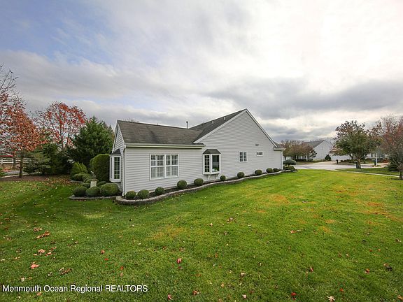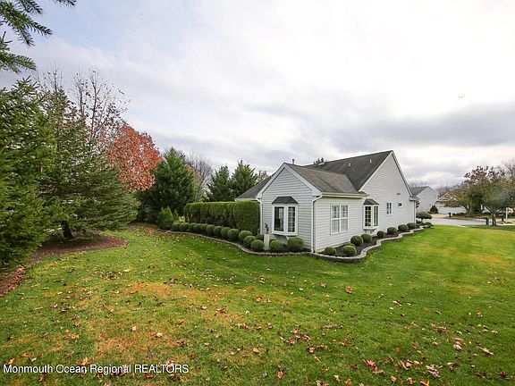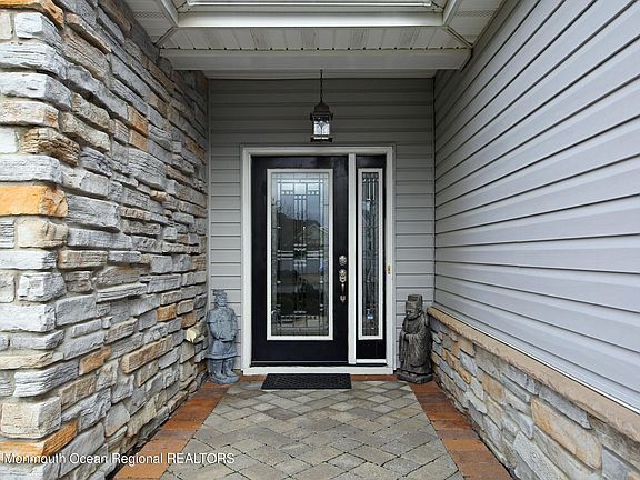 The jewel of Jumping Brook. Expanded Augusta at end of cul de sac adjoining common area. Custom stone front, paver drive and walkway, and professional landscape set the tone for this inviting home. Open bright layout with wood floors, decorative moldings, wet bar, french doors and so much more. Primary retreat offers access to expansive private rear patio and custom bath, dual vanities, heated marble floors. Expansive wrap-around paver patio, granite topped stone bar and electric awning. Truly one of Jumping Brook's finest homes. Convenient to highways, shopping and some of New Jersey's finest beaches.