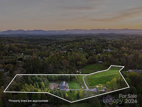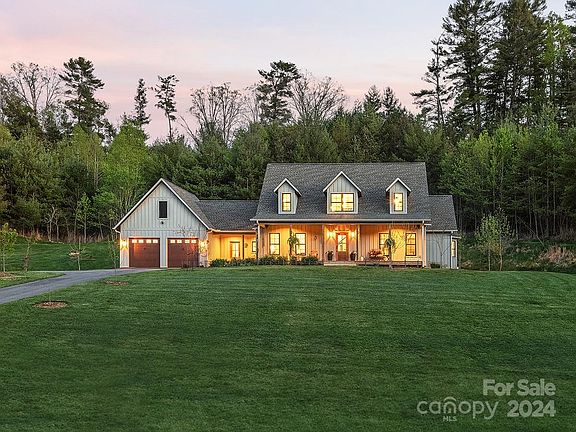 WEAVERVILLE 2020 LUXURY MODERN FARMHOUSE ON 9.3 GORGEOUS ACRES | PRIVATE, GENTLE STREAM, BARN, FULLY FENCED, EXPANSIVE IRRIGATION SYSTEM, PASTURES AND TRAILS. Stunning architecture and fine craftsmanship set amidst two pastures w/mountain views, incredible 3000 squ ft barn/workshop with 2 12' carports, and manicured forested trails for hiking or exploring by golf cart or ATV. Bask on the expansive covered front porch gazing out over the pristine lawn, gardens, stream, horse pasture and barn. Open expansive main floorplan w/vaulted living room, den, eat-in chef's kitchen, spacious pantry/laundry, light-filled dining, luxurious primary suite and private study. Upper floor w/2 ensuite guest rooms and lovely reading loft. Indoor living spaces flow effortlessly to outdoor living spaces for entertaining and relaxation. Charming shared private lane entry and gentle driveway access to your own private estate. One gigabyte super high speed internet. No HOA! This is your WNC dream property!