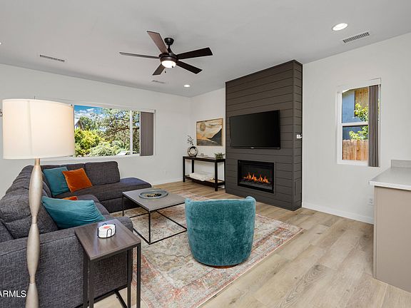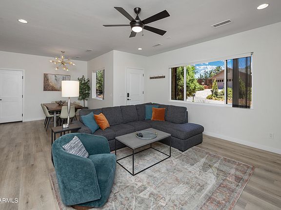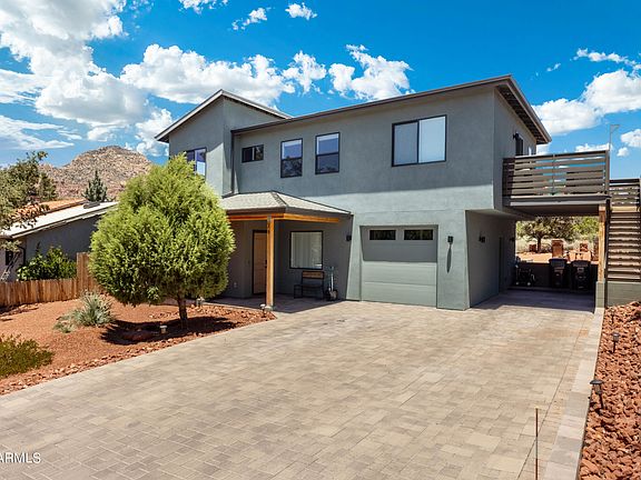 West Sedona Sanctuary w/ Spectacular Red Rock views, Guest Residence & NO HOA. Completed in 2020, this newer, contemporary home is perfectly designed w/ open floorplan, fully equipped kitchen, fireplace, entertainers bar, office/yoga room, granite countertops, modern fixtures & designer touches throughout. Home offers all the comforts of luxury w/ 2 bedrooms plus 2 flexible spaces for a total of 4 beds in the 1,768 sq. ft. main house, plus 338 sq. ft. guest residence w/ private entrance, kitchen, and dedicated laundry. Garage is currently being utilized as a game room, offering an additional 338 sq.ft. not included in square footage. Entire home has also been pre-wired for security and audio/smart home system. Walk out your door and onto the Trailhead or see MORE. Take in the Sunsets w/ stunning Red Rock views from Backyard Balcony and Patios, or Private Casita w/ Deck. Generously sized back yard is large enough to accommodate addition of pool and/or spa to add ambiance while taking in these amazing views. The home is perfectly poised in the serenity of the Red Rocks while simultaneously located just minutes away from Restaurants and Shops! This Sedona Stunner would make the perfect investment or Dream Home. All furnishings are available for purchase for turn-key home and STR property projections are available upon request.