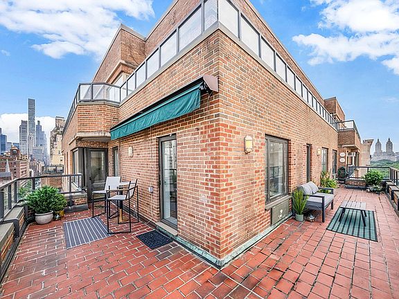 Across the gallery, the oversized formal dining room—also with terrace access—sits adjacent to a windowed kitchen. The kitchen includes double sinks and enough space for a dining table, making it both functional and inviting. Both bedrooms are en-suite. The corner primary suite boasts double exposures, terrace access, two large closets, and a windowed bathroom. The second bedroom, currently used as a media room, includes an oversized closet and en-suite bath. The terrace is a true showstopper. With three access points and two wings, it’s an entertainer’s dream, offering panoramic views of Central Park, Madison Avenue, the Upper East Side, and Midtown. Adding to the appeal is a private staff room on the 15th floor, complete with an en-suite bath and Central Park views. The low monthly maintenance of $2,863 includes this additional space. A Washer and Dryer can be added with board approval.