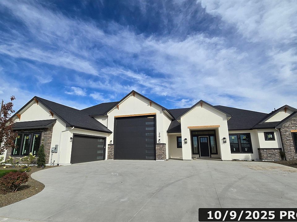 Welcome to the Ellis! This beautiful home has room for everyone! Spacious primary suite boasts beamed ceiling, feature wall and oversized walk-in closet. Primary bath w/luxurious free standing tub, walk-in tiled shower plus dual vanities. 2nd primary bedroom with feature wall & walk-in closet as well and BOTH suites overlook the covered patio and backyard. ALL bedrooms have their own bathroom! Along with the 4 bedrooms, spacious gathering in the great room/living area with cozy stone fireplace PLUS an additional media room. 2149sqft garage! 21x40ft RV garage w/sink plus 15x16 partially enclosed loft for endless possibilities. Nearly 3/4 Acre lot w/North facing backyard, firepit area & pressurized irrigation w/HUGE covered patio & views toward Shafer Butte & the Boise foothills. Beautiful home by local builder, Eaglewood Homes! ** Loft in garage