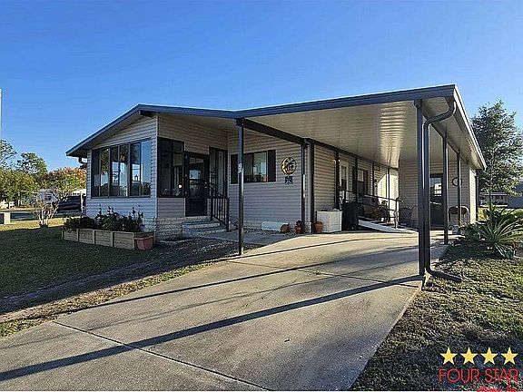 Welcome to your Florida retreat! This beautifully maintained 936 sq ft double wide sits on a raised slab foundation and offers 2 bedrooms and 2 bathrooms, perfect for year-round living or a seasonal escape. Step into the four-season glass porch and enjoy tranquil views of the ponds, ideal for morning coffee or evening relaxation. The home features cathedral ceilings that create a spacious, airy feel, and a metal standing seam roof for durability and peace of mind. Additional highlights include, Central AC for year-round comfort, Carport with laundry room for convenience, Removable ramp for accessibility, Storage shed for tools and extras, Low lot rent in a well-kept community. Spanish Villages offers a vibrant lifestyle with activities, a pool, and a clubhouse, all just minutes from shopping, dining, and medical facilities. This home is move-in ready and priced to sell, do not miss your chance to own a slice of paradise in one of Lake Counties most desirable communities! Request a virtual showing or schedule an appointment to view.