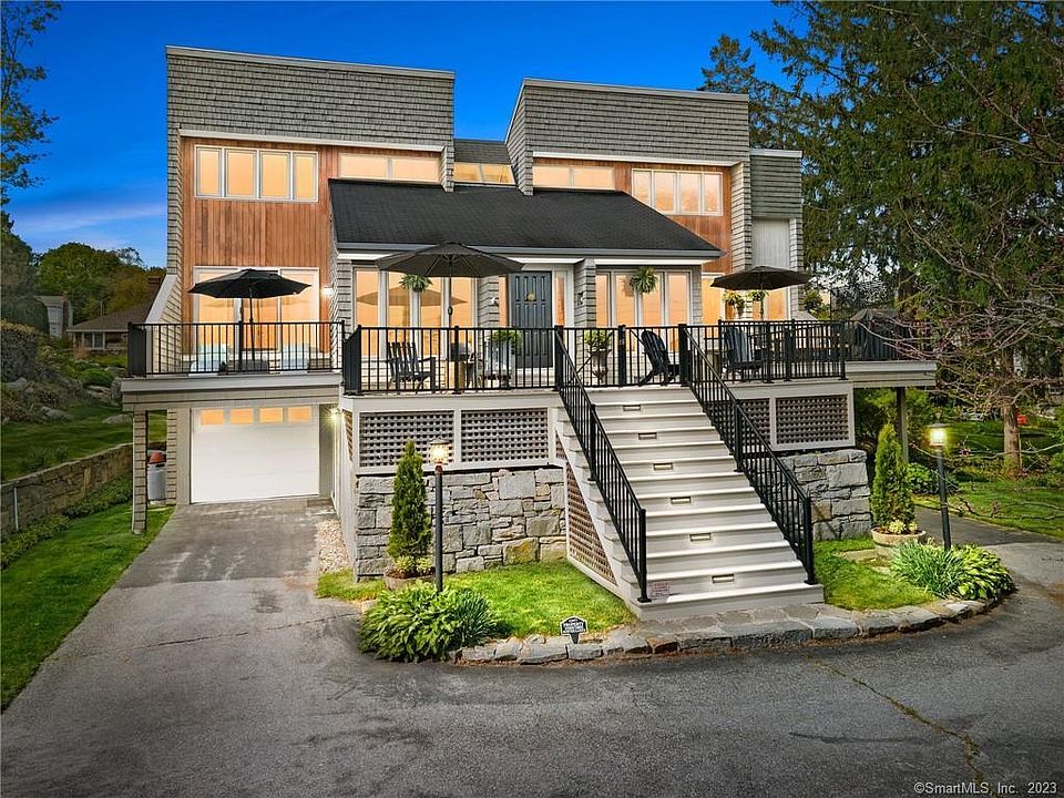Stunning contemporary home sited just outside of Noank Village and minutes from downtown Mystic with beautiful water views throughout. With direct water views from every room, you will fall in love with this location: boats in the harbor, sailboats in the sound, sunrises & sunsets. Spacious living areas & open concept kitchen provide an ideal environment for entertaining and enjoying quality time with guests, friends, and family. Large windows & sliders bring in an abundance of natural light that open to a sprawling trex deck. In addition, this home boasts a gas fireplace for ambiance and chilly nights, high ceilings, beautiful lighting, an upstairs loft/office area, and ample storage! Head down the hall past the powder room to a main bedroom suite featuring a bright atmosphere, a well-appointed bath and large walk-in closet. Enjoy private access to the deck to enjoy the beautiful water views, perfect for sipping your morning coffee. Upstairs you will find two additional bedrooms and the second full bath with tub/shower. Lower level offers additional guest space and features walk out access to the back yard and the garage. Half bath with laundry completes this space beautifully. Outside and you will be instantly charmed by custom landscaping, newly planted flower beds, and a fire pit. This home features many recent updates including full interior home repaint, new lighting, new carpets, kitchen hardware, appliances, new gutters, and more. Walking distance to local beaches, boat docks, & several points of public coastal access! Located just a few minutes from downtown Mystic! Mystic CT is a Charming Coastal Community with its quaint downtown area with restaurants and shops, historic architecture, and scenic waterfront with the Mystic River, Long Island Sound, and numerous parks and nature preserves in the area, there is no shortage of outdoor activities to enjoy, from hiking and biking to boating and fishing. Cultural Attractions: Mystic is also home to several world-renowned cultural attractions and events, including the Mystic Seaport Museum and the Mystic Aquarium, the annual Mystic Outdoor Art Festival and the Mystic River Oyster Festival to name a few.Home is walking distance to Noank Play Area which includes basketball/tennis courts plus playgrounds. This home is conveniently located within driving distance of several major cities, including Boston, New York City, and Providence, making it a great location for those who want to live in a quieter, more suburban area while still having easy access to big-city amenities.