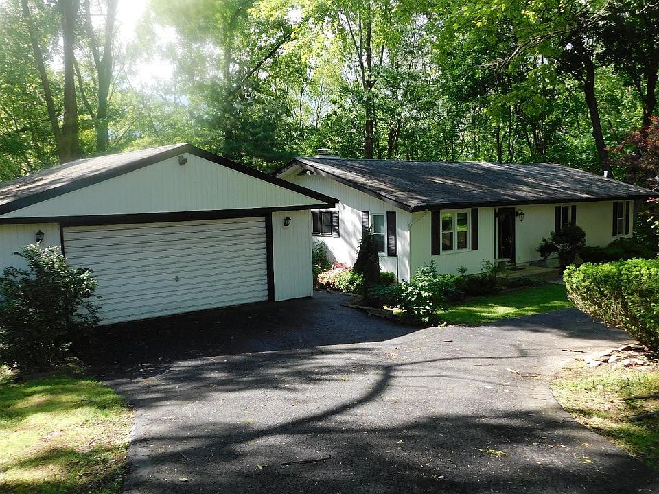 Picturesque Rancher on Wooded Lot with Circular Driveway. This 4 bedroom 3 bath home features a Modern Eat-In Kitchen with water proof Upgraded Laminate flooring, Glass-Top Stove, Self Cleaning oven, Bosche Dishwasher, Built-In Pantry, Tile Back-Splash, Island & Recessed lighting. Living room with Vaulted Ceiling & 2 Sky lights. Carpeted Dining room with Sliding glass door to Private Deck backing to woods. Main Bedroom has a Walk-in closet, Ceiling fan, Carpet, access to your Private Deck & a Full Bathroom with Tiled Stall shower. Nice size 2nd & 3rd Bedrooms have Hardwood Flooring, Ceiling fans & Double closets. Hall bathroom with Tiled Flooring, Tiled Tub, New Vanity & Linen closet. Large Hall closet, Linen closet & Coat closet in Foyer complete the main level. Large Finished Lower Level Family room Has a Wood insert Fireplace with electric fan, 4th Bedroom or office, Full Bathroom with Stall shower,Laundry room, 2 Large storage areas, one with shelving. Access to the back of the home. 2 Car Detached Garage, Most New Windows, Newer Heater & Central Air.