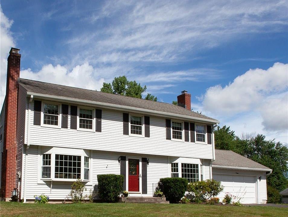 Welcome to this beautiful and charming Colonial nestled in one of Poquonock's most desirable and peaceful neighborhoods. This 4 BR, 2.5 BA home sits perfectly on an impressive and spacious lot, with an expansive backyard equipped with patio, sun porch, garden beds, and an oversized shed. Upon entering this home, you'll find an inviting and bright living room with gleaming hardwood floors, a brick fireplace and custom built-ins. The sun-filled dining room leads to the centrally located kitchen, complete with country cabinetry, farmhouse tile backsplash, and a large garden window overlooking the back patio and lush back yard. The kitchen leads to an oversized family room with yet another brick fireplace and more custom built-ins. The picturesque bay window basks this room in light, guiding you past the half bath and toward the oversized sun porch; the perfect spot for enjoying your morning coffee or watching a summer storm. Freshly painted bedrooms and bathrooms await you on the upper level. The large master bedroom boasts an ensuite bathroom and walk in closet. Down the hall, you will find three generously sized bedrooms plus another full bathroom. The entire upstairs is adorned with hardwood floors, bright windows, and ample closet space. The large unfinished basement offers a third fireplace, workbenches, tons of storage space and plenty of potential. Private and peaceful living with convenient highway access... this home has it all!