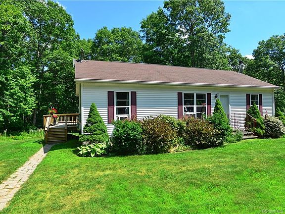 Lovely Country Ranch. Built in 2002. Living Room with Hardwoods, Eat in Kitchen with new Stainless steel Double Sink & faucet, New Stainless Refrigerator. . Newer Dishwasher & oven/range, All appliances to stay. Large Master Bed with private bath, 2 full closets, carpet. 2 additional bedrooms with carpets and 2nd full bath. Side door off deck enters into handy mud room with hardwoods. Washer & dryer in walk out basement. New Hot water tank.New Wood Stove to supplement the heat. Radon system in place. Nice private backyard on 1 acre lot. New large back deck. Multiple zones Electric heat, Leaf free gutter system. Easy maintenance vinyl siding. Firetower Rd off Route 44 just over the Pomfret Line. Pretty scenic stone walls borders the property. Lot is across from 100+ acres of Natchaug state forest. Serene Setting. A great pace to call home. Woodstock Academy is High School. Great Commuter location.