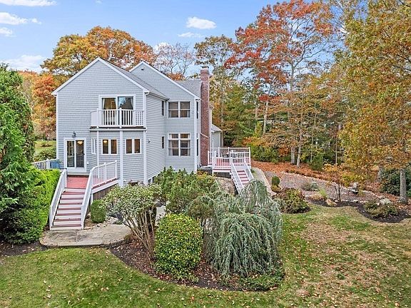 This immaculate 4-BR, 2.2-BA residence, nestled at the end of a peaceful cul-de-sac in the exclusive Sunrise Cove community of S. Dartmouth, offers privacy & tranquility. Flooded w/ natural light, the spacious sunken living room features a mahogany bar & an elegant marble fireplace, perfect for entertaining. French doors seamlessly connect indoor & outdoor spaces. The sunlit kitchen boasts granite countertops & a large center island. The master suite includes a private balcony w/ water views, providing a serene escape. Beautiful craftsmanship & meticulous attention to detail elevate every space in this custom built home. The finished BM provides versatile space for a home gym, media room or guest quarters. A private gate to the path leads you to the private assoc. beach w/ mooring opportunities. The prop. grounds are beautifully landscaped w/ mature trees, specimen planting, flower beds, masonry fieldstone walls & a flagstone patio. Short distance to charming Padanaram Village/Harbor.