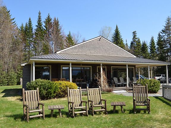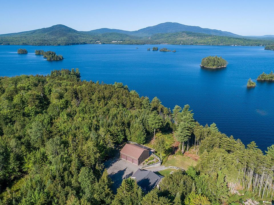 Enjoy expansive westerly lake and mountain views, along with some of the most spectacular sunsets you'll see anywhere! This efficient lakefront home is tucked in amongst the pines on a large 2-plus acre, beautifully landscaped lot, just minutes from downtown Greenville via car or by boat. Amenities include Andersen windows & doors, maple floors, a whole-house water filtration system, (2) 1000 gallon propane tanks, and more. An oversized 3-bay heated garage features guest quarters on the lake-side with a large deck overlooking the lake. At the shore, there's 215 ft of privately owned deep water frontage. A moderately sloping cart path meanders down to the water's edge where you'll find steps leading to your quality aluminum and wood dock with 2 floating sections. Both the home and guest quarters will be sold partially furnished.