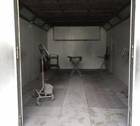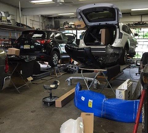 3825 sf -3 work area bays, 1 spray paint bay, high ceilings, 12 foot roll up doors, extra 2500sf storage on 2nd floor 1 year lease