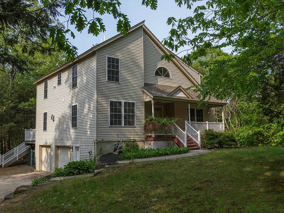 This is it! The one you have been waiting for. Spacious sun filled contemporary home located in the desirable Colby Pond subdivision. Stately & Welcoming featuring a farmers porch the home is beautifully sited and borders natural undeveloped common land. The floor plan is open and ideal for entertaining. The kitchen has stainless steel appliances, pantry, breakfast bar and is open to the family room. There is a formal living room with a gas fireplace (currently not working, being sold "as is"). The three season room with vaulted ceiling, skylight and ceiling fan has sliders leading to the deck which overlooks the private backyard featuring a 40'x30' fence with 2 gates. Completing the first floor is a bedroom, a 3/4 bath w/ roll in shower and stackable washer/dryer. The second floor hosts an en suite primary bedroom, 2 spacious bedrooms, a full bath and reading nook. Notable features: Central Air, Included is a 1 year AHS Home warranty, Briggs & Stratton Automatic Generator, washer & dryer. The Colby Pond subdivision has nearby walking trails, recreational ATV & Snowmobile trails and two ponds ideal for ice skating and fishing. Centrally located to the Seacoast, NH's Lakes Region & Boston MA, Danville is the perfect country setting. Subject to seller securing suitable housing. Town card states home is 4 bedroom, septic design on file shows a 3 bedroom system.
